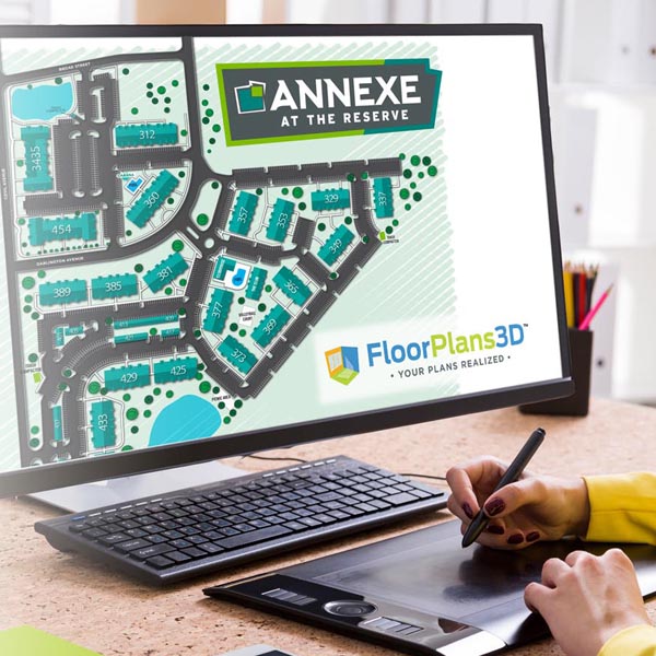 Your floorplans shouldn't be the only part of you community that looks spectacular! Our maps are full-color matched to your community's style and full of detail: roads, amenities, parking areas, pools, clubhouses, pet areas, tennis courts, gazebos, sun decks, offices, fitness centers... your community has it all, so let's show it off!